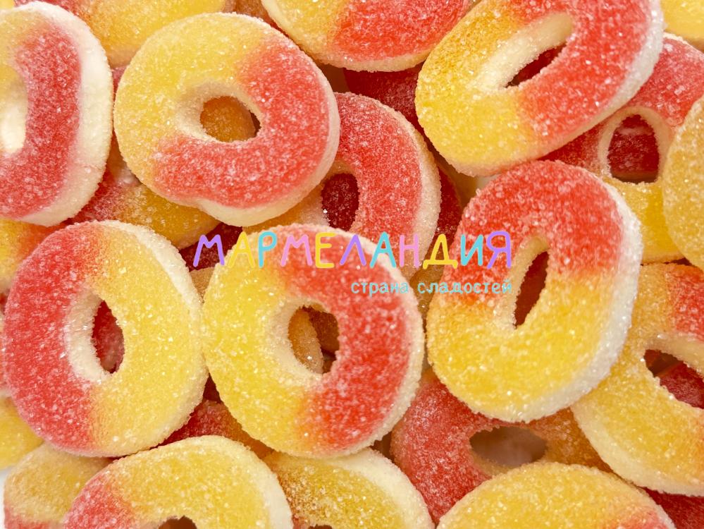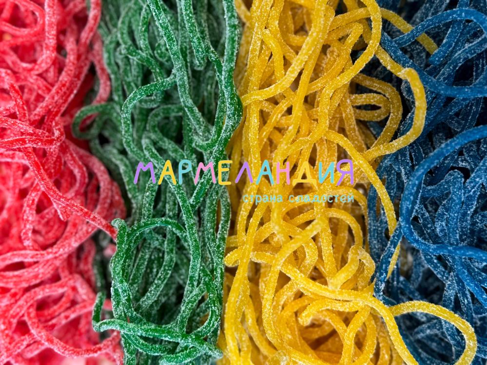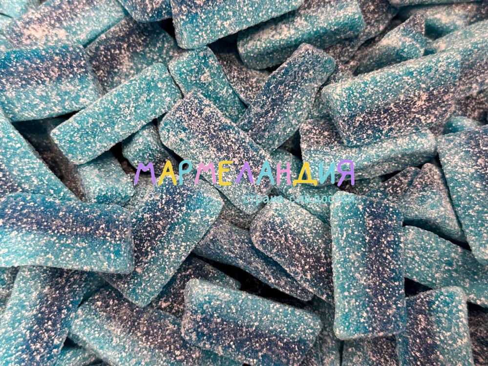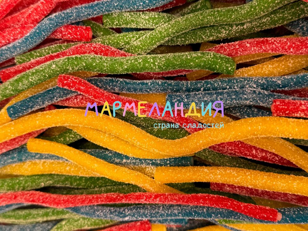 Состав: глюкозный сироп, сахар, нонпарели (сахар, кукурузный крахмал, модифицированный крахмал, глюкозный сироп, глазирователь: воск карнаубский, красители (E133, E129, E171)), вода, желатин, модифицированный кукурузный крахмал, лимонная кислота, ароматизатор, красители (E171, E129, E133).